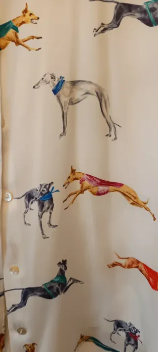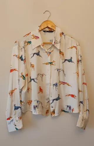 Blusa satinada corta de Zara con un estampado precioso de perros galgos en varios colores. Es una prenda ligera y fluida, perfecta para añadir un toque original. De vestir, elegante. Ideal con pantalón de vestir, o look con vaqueros. Más prendas en mi perfil. Por varias prendas hago precio - Estampado de galgos. - Tejido satinado. - Cuello camisero. - Cierre de botones.