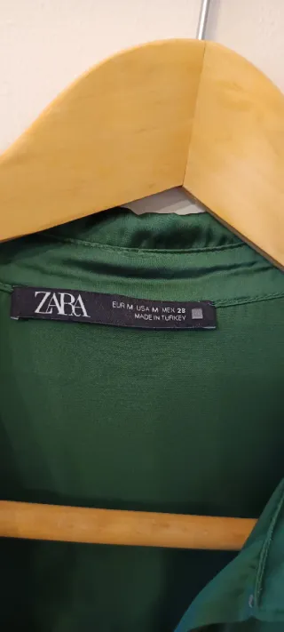 Elegante blusa de Zara con un acabado satinado. Elegante - Color verde botella. - Cuello camisero. - Cierre de botones. - Manga larga.