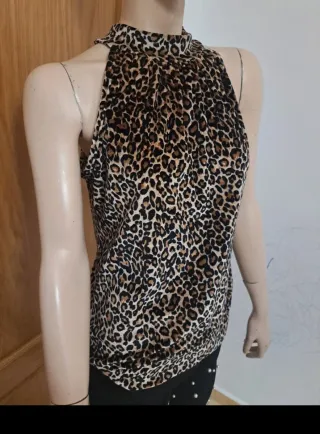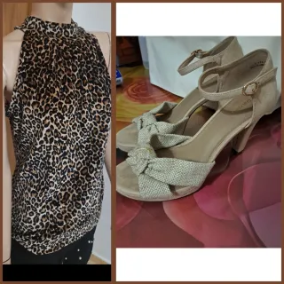 Conjunto de blusa con estampado de leopardo y tacones. Talla L de terciopelo marca italiana + tacones de lazo beis talla 39.5 /40 Marca graceland Estan como en la foto - Blusa con cuello halter. - Tacones con detalle de lazo. Todo por el mismo precio!! Solo hago envios!!