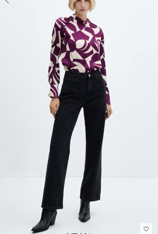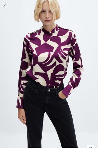 Elegante blusa de Mango con un llamativo estampado. - Tejido satinado con caída. - Diseño de cuello alto. - Mangas largas. - Detalle de hombros.