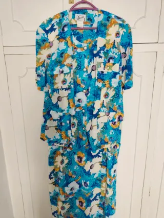 Conjunto de blusa y falda con un estampado floral vibrante en tonos azules y blancos, con detalles en amarillo y naranja. La blusa tiene manga corta y cierre de botones nacarados. La falda es larga y fluida con abertura central posterior. - Blusa con dos bolsillos delanteros y hombreras. - Falda con forro interior. - Cierre de botones en la blusa. - Estampado floral muy animado