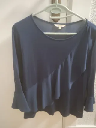 Elegante blusa azul con un diseño de volantes asimétricos. - Mangas largas acampanadas. - Detalle de volante diagonal. - Bajo con forma. - Pequeño detalle metálico en el bajo.