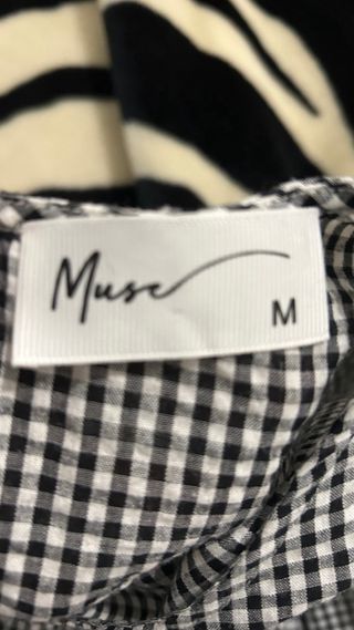 Blusa con estampado de cuadros vichy en blanco y negro. Presenta un diseño con volante en la parte inferior y mangas cortas. - Cuello redondo. - Cierre de cremallera en la espalda. - Mangas abullonadas.