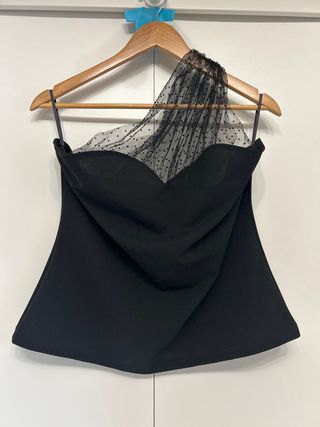 Elegante blusa negra con un diseño asimétrico y un detalle de tul con lunares en el escote. - Escote asimétrico. - Detalle de tul con estampado de lunares. - Tirantes finos.