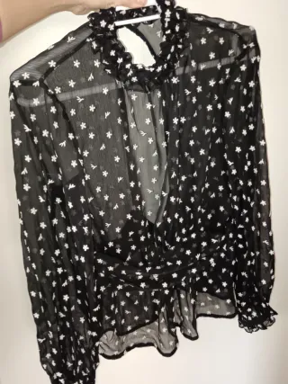 Elegante blusa con un delicado estampado floral. - Diseño transparente. - Cuello alto con volantes. - Mangas largas. - Cierre de botón en la nuca. La cremallera está rota, pero nunca se ha puesto