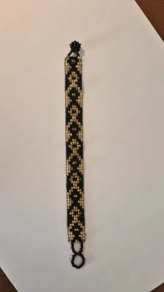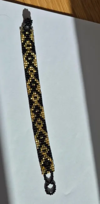 Pulsera tejida con un diseño de cuentas en tonos dorados y negros. Es un accesorio llamativo y elegante. - Diseño geométrico. - Cierre seguro.
