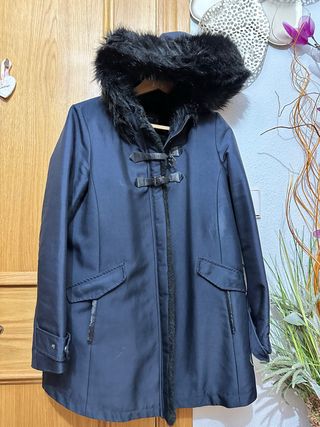 Abrigo estilo trenca de Zara, perfecto para el frío.pelo por debtro - Capucha con pelo sintético negro. - Cierre con trabillas y botones. - Bolsillos delanteros con solapa. - Detalle de pelo sintético en la cremallera.