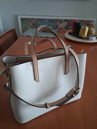 Bolso de mano y hombro con un diseño elegante. - Mide 24 cm ancho x 21 cm alto x 14 cm de fondo. La correa es de 110 cm. - Color gris-beige. Logo Parfois interior. - Asas de mano y correa ajustable para el hombro. - Cierre de cremallera. Bolsillo pequeño interior.