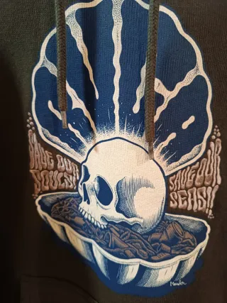 Sudadera con capucha de la marca RVCA. Presenta un diseño gráfico estampado y letras bordadas. Semi nueva.