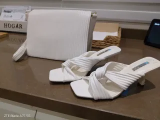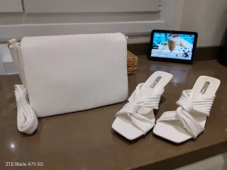Elegante conjunto de bolso y zapatos a juego, perfectos para complementar tu atuendo. - Bolso blanco con detalle de cadena dorada. - Zapatos blancos tipo mule con tiras retorcidas. - Diseño moderno y chic. Todo por 15€