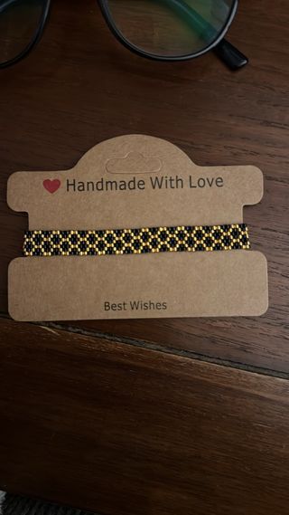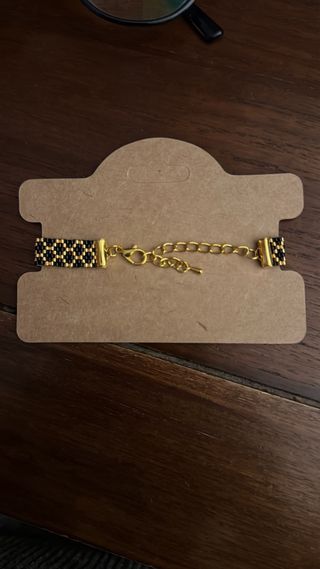 Pulsera hecha a mano con delicas de Miyuki en tonos negro y dorado. Diseño tejido con mucho detalle, elegante y fácil de combinar, perfecta para uso diario o para darle un toque especial a cualquier look. Ligera, cómoda y realizada con mucho cariño 💛 Ideal también para regalar.