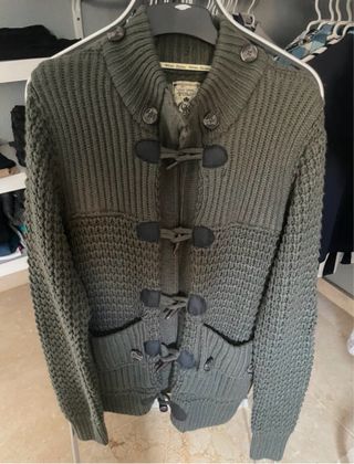 Jersey de punto grueso vintage en color verde oliva. Presenta un diseño con cuello alto abotonado y cierre de cordones con botones. - Cierre de cordones y botones. - Bolsillos delanteros. - Puños y bajo de canalé.