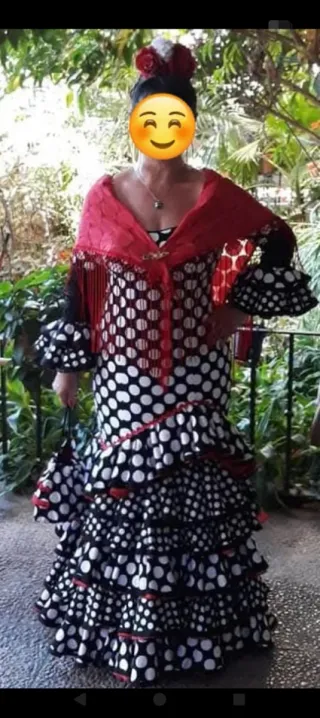 Traje de flamenca con un diseño espectacular, usado sólo un par de ocasiones. Cómo nuevo. - Talla 44/46. - Mangas acampanadas. - Adornado con flecos. - Falda con volantes.