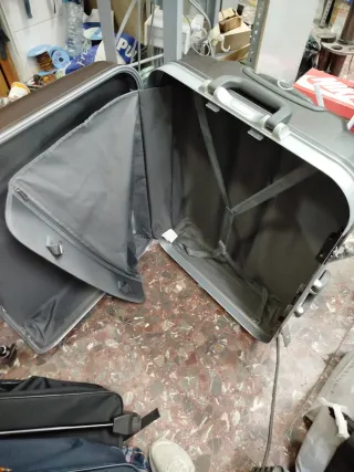 Vendo juego de maleta y neceser de la marca Fun&basics. Son de color plata y azul. - La maleta es de tamaño mediano, con ruedas. - El neceser es pequeño, ideal para viajes cortos. - Ambos están en buen estado, con ligeras señales de uso.