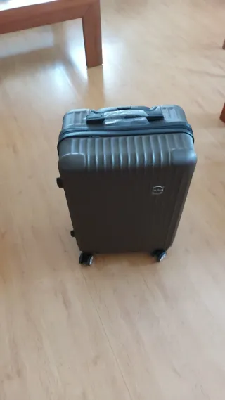 Maleta de viaje nueva todavía lleva el plástico protector. Conserva ticket de compra original, lleva un golpe en un lateral. - Cuatro ruedas para facilitar el transporte en perfecto estado. - Color plateado.