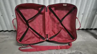 Maleta de viaje en color rojo de tela. Ruedas y cremalleras funcionan. El asa está un poco doblada pero funciona. Sube y baja perfectamente
