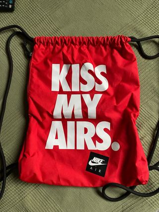 Práctica bolsa de deporte con un diseño llamativo. - Color rojo vibrante. - Mensaje Kiss My Airs en blanco. - Logo de Nike Air en la parte inferior.