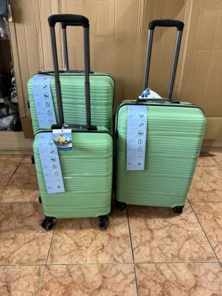 Conjunto de tres maletas de viaje fabricadas en ABS. - Material: ABS. - Dos asas de mano - Asa telescópica extensible - 4 ruedas giratorias 360⁰. - Candado de combinación integrado. Medidas : - Grande 75 x 48 x 28. - Mediana 65 x 44 x 24. - Cabina 55 x 35 x 21
