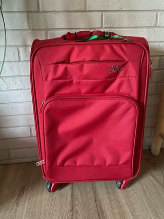 Maleta mediana de color rojo, ideal para viajes. - 4 Ruedas para facilitar el transporte. - Asa extensible. - la maleta está en perfecto estado. Solo le falla el asa, que está atado con unas bridas, como se ve en la foto.
