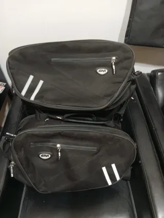 Conjunto de bolsas de viaje para moto de la marca Givi (semirigidas) - Color negro. - Diseño moderno con detalles reflectantes. - Incluye fundas impermeables para lluvia
