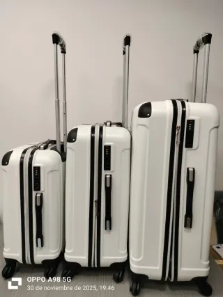 Vendo Conjunto de tres maletas de viaje de color blanco, ideales para organizar tus pertenencias. - Fabricadas en ABS. - Diseño con ruedas para facilitar el transporte. - Incluye etiquetas informativas sobre sus características. La grande de 23 a 28 kilos La mediana de 20 a 23 kilos La cabina de 10 kilos