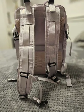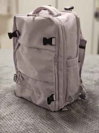 ¡Mochila de viaje perfecta para aerolíneas low cost como Ryanair, Vueling o EasyJet! Medidas aproximadas 40x30x20 cm (ideal para equipaje de mano gratuito, cabe bajo el asiento sin problemas). Color gris/lavanda elegante, resistente al agua, con puerto de carga USB externo (conecta tu powerbank dentro). Muchos compartimentos: bolsillo para portátil, antirrobo, lateral para botella, apertura amplia como maleta y espalda transpirable. En excelente estado, muy espaciosa y cómoda. ¡Ahorra en facturación!
