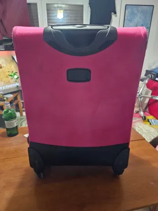 Maleta algo más pequeña que una de cabina, con un llamativo color rosa. Perfecta para tus viajes cortos. Tiene bastante uso, se puede ver la pintura se está saliendo. Sin embargo, las ruedas están en perfecto estado, siendo todavía funcional. H50xW33x21