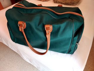 Preciosa bolsa de viaje, ideal para escapadas. Se encuentra en buen estado. También se acompaña de neceser a juego. Cremalleras en perfecto estado. - Asa de mano. - Cremallera principal. - Compartimento adicional con cremallera. El bolso tiene un pequeño descosido en un lateral. Nada importante y no afecta a su utilidad.