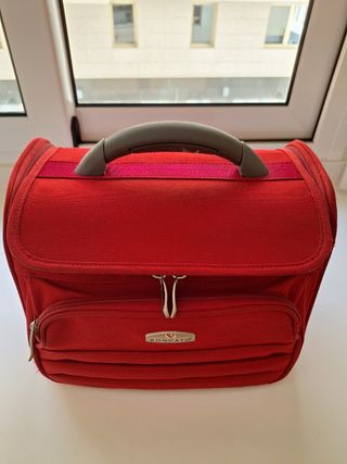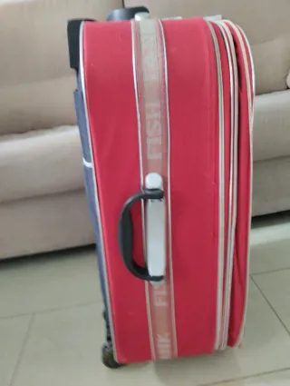Maleta de viaje en color rojo, con un maletín integrado. Es un poco pesada. - Ruedas para facilitar el transporte. - Asa extensible.