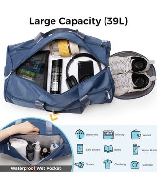 Preciosa bolsa de deporte de la marca BALLADHOME, en color azul. Es espaciosa y perfecta para llevar todo lo necesario al gimnasio o en tus viajes. - Gran capacidad (39L). - Bolsillo impermeable para ropa mojada. - Compartimento para zapatos. - Asa superior y correas para el hombro.
