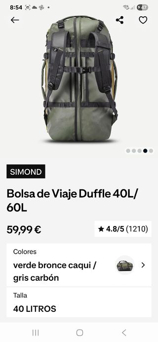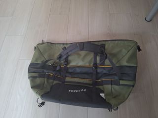 Vendo práctica bolsa de viaje. Es espaciosa, y se puede portar tanto en espalda, tipo mochila o en mano tipo maleta. Capacidad de 60L o reducción a 40L. Usado una única vez, como nuevo. - Diseño ligero y resistente.