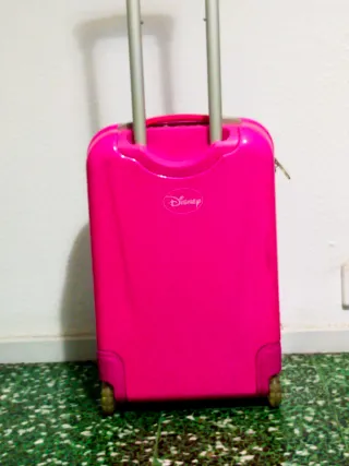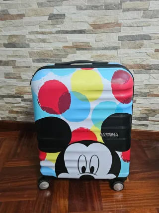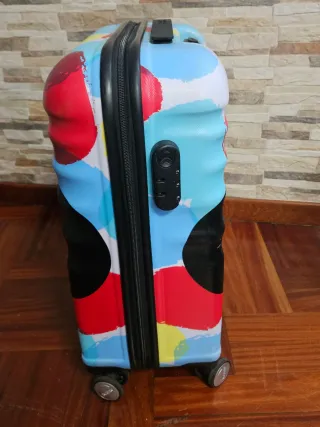 Maleta de viaje con un divertido diseño de Mickey Mouse. - Diseño frontal de Mickey Mouse. - Estampado de lunares multicolor. - Ruedas para facilitar el transporte. Tiene un solo uso, con cierre de seguridad mediante código y en perfecto estado. Tiene la medida standar para poder llevarla también en cabina. Su precio de compra fue 100 euros. Ideal en estas fechas para regalo de Reyes.