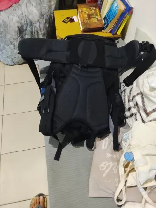 Dispone de barras de aluminio para limitar las zonas de apoyo y dejar respirar la espalda, un interior compartimentado y 5 bolsillos. Tiene un peso de 1,6kg y medidas de 58x26x25 cm Sólo se ha ausado en un viaje,está un poco manchada por arriba.