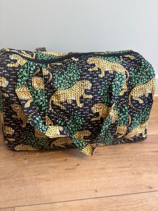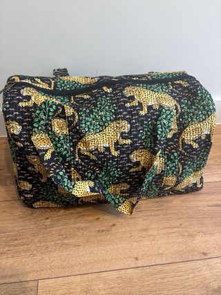 Práctica bolsa de viaje con un llamativo estampado. - Diseño acolchado. - Estampado de leopardos y vegetación. - Asas cómodas para su transporte.