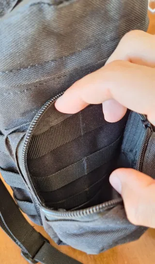 Práctica bolsa táctica, ideal para senderismo, acampada y con trabillas. - Material resistente. - Compartimento frontal con cremallera. - Sistema MOLLE para sujeción. - Incluye mosquetón. Ojo: Botella no incluida, solo para referencia visual.