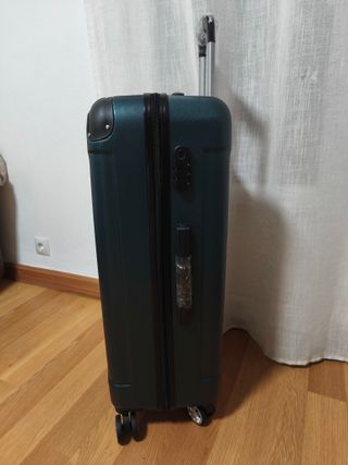 Maleta de viaje de tamaño mediano, ideal para escapadas. - Color verde oscuro. - Diseño rígido con acabado texturizado. - Cuatro ruedas multidireccionales. - Asa extensible y asas de mano. - Candado de combinación integrado.