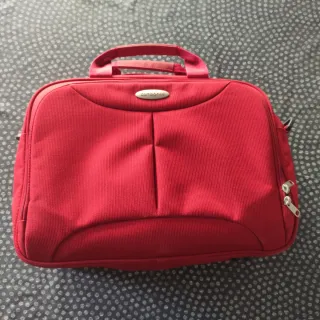 Bolso de viaje Samsonite en color rojo. Sin usar ( la foto de la garantía es solo para demostrar que no tiene uso, pero no está vigente). Medidas aproximadas (alto, ancho, profundo): 33 x 43 x 16 cm. Dispone de: - Compartimento principal espacioso. - Bolsillo frontal. - Sistema para sujetarlo al tirador de una maleta. - Asas de mano y correa ajustable.