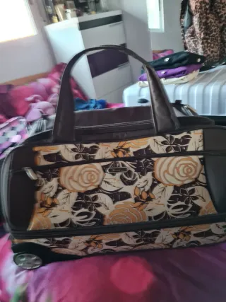 Práctica bolsa de viaje con un bonito estampado. - Diseño floral en tonos morados y rosas. - Asas de mano y correa ajustable para hombro. - Compartimento principal con cierre de cremallera.