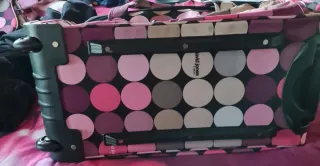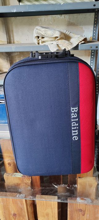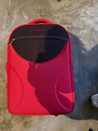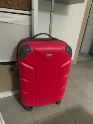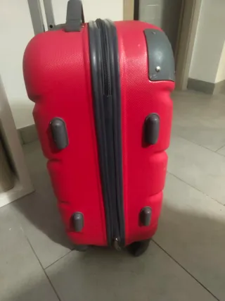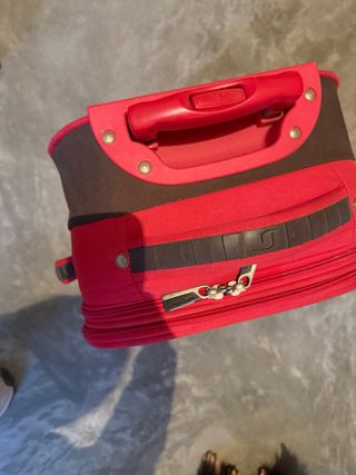 Maleta de viaje en color rojo de tela. Ruedas y cremalleras funcionan. El asa está un poco doblada pero funciona. Sube y baja perfectamente