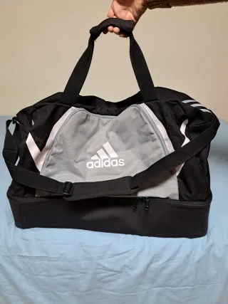 Práctica bolsa de deporte Adidas con un diseño moderno y gran capacidad. - Compartimento inferior independiente con cremallera, ideal para llevar calzado. - Asas de mano y correa para hombro. - Detalles en blanco y gris. - Bolsillo exterior con cremallera para almacenaje independiente. - Bolsillo interior amplio. - Medidas 30 (ancho) * 58 (largo) * 38 (alto).