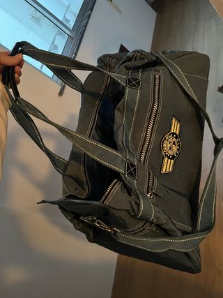 Bolsa de viaje de estilo vintage con un diseño práctico y espacioso. - Compartimento principal con cierre de cremallera. - Bolsillos exteriores adicionales. - Asas de mano y correa de hombro. - Parche decorativo con logo.
