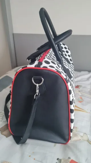 Bolso de viaje con un divertido estampado de lunares y siluetas de Mickey Mouse. - Diseño clásico de lunares negros sobre fondo blanco. - Asas superiores negras. - Cierre de cremallera con borde rojo.