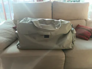 Conjunto de viaje de color gris, marca Mango compuesto por Bolsa grande viaje con largo 60cm, alto 37cm y fondo 19 cm (gran capacidad) bolsillos interior y exterior con cremallera y apertura hasta la parte inferior de la misma bolsa lo que facilita colocar las prendas de viaje, bolso de 35x34 cm con bolsillos interior y dos exteriores con clip y cremallera para facilitar el acceso a documentos u otras pertenencias y cartera de 15x11 cm. Usado todo en una ocasión, como nuevo y en perfecto estado.