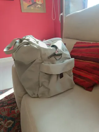 Bolso maternal con un bonito estampado de lunares blancos sobre fondo gris. Es espacioso y práctico para llevar todo lo necesario al hospital para dar a luz,o para ir de viaje... - color gris - tejido resistente de alta calidad - Correas de hombro ajustables. - Bolsillo frontal con cremallera. - Interior forrado con el mismo estampado y texto MY SWEET DREAMS. Impecable, como nuevo
