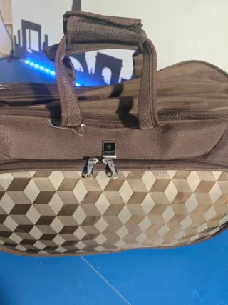 Funda porta trajes grande color camel con detalles en marrón. Totalmente nueva, sin estrenar y con etiqueta. Incluye candado en los cierres para mayor seguridad. Ideal para llevar trajes o vestidos sin arrugas. Material resistente tipo polipiel. Bolsillo exterior con cremallera para accesorios. - Material resistente y duradero. - Diseño elegante con detalles en contraste. - Asas para un fácil transporte.p Precio negociable