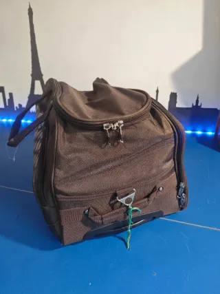 Práctica bolsa de viaje de color marrón, ideal para escapadas o para llevar tus pertenencias. - Material resistente. - Dos asas para llevar cómodamente. - Compartimento inferior con cremallera.