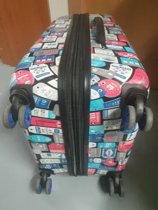 Maleta de viaje con un diseño original y llamativo de etiquetas de aeropuertos internacionales. Medidas Alto 62, Ancho 42, fondo 30 - Diseño impreso de etiquetas de viaje. - Ruedas para facilitar el transporte.