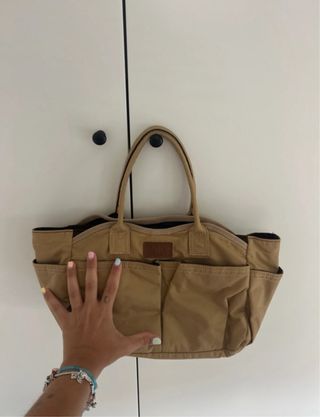 Bolso de Adolfo Domínguez con un diseño práctico y espacioso. - Color beige con detalles en marrón. - Múltiples bolsillos exteriores para organización. - Asas cómodas para llevar al hombro o en la mano.