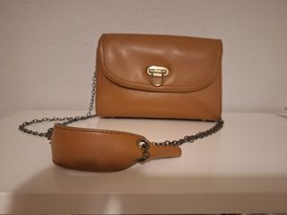 Bolso de hombro en polipiel en color camel con cadena y detalles en dorado envejecido. Consta de 2 departamentos interiores y otro con cremallera y otro exterior. Es de Adolfo Domínguez U Medidas: Alto 15 cm Ancho 22 cm Profundidad 9 cm