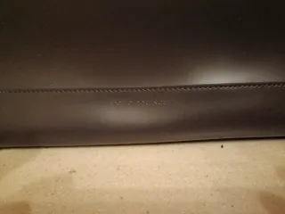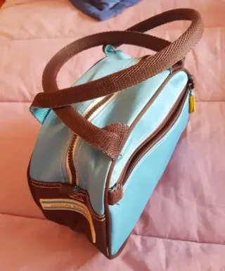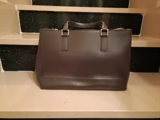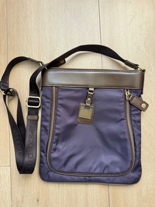 Usado muy poco. Está como nuevo. Ningún desperfecto y el cuero impoluto. Es de tela y cuero marrón oscuro, con tres bolsillos interiores: una cremallera y dos bolsillos.